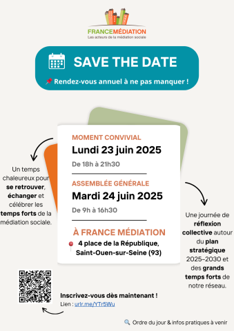 Les 23 et 24 juin 2025, France Médiation vous accueille à Saint-Ouen-sur-Seine (et en visio) pour un moment convivial suivi de son Assemblée Générale. Ce sera l’occasion de revenir sur les temps forts de 2024, de partager les avancées du secteur et d’évoquer ensemble les défis à venir.